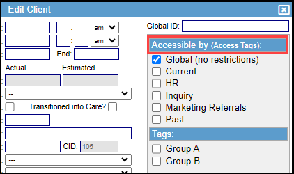 Access Tags can restrict or allow a users access to specific contacts. As a general rule, most contacts should only have one Access Tag. Access tags may also be labeled as "Accessible by."