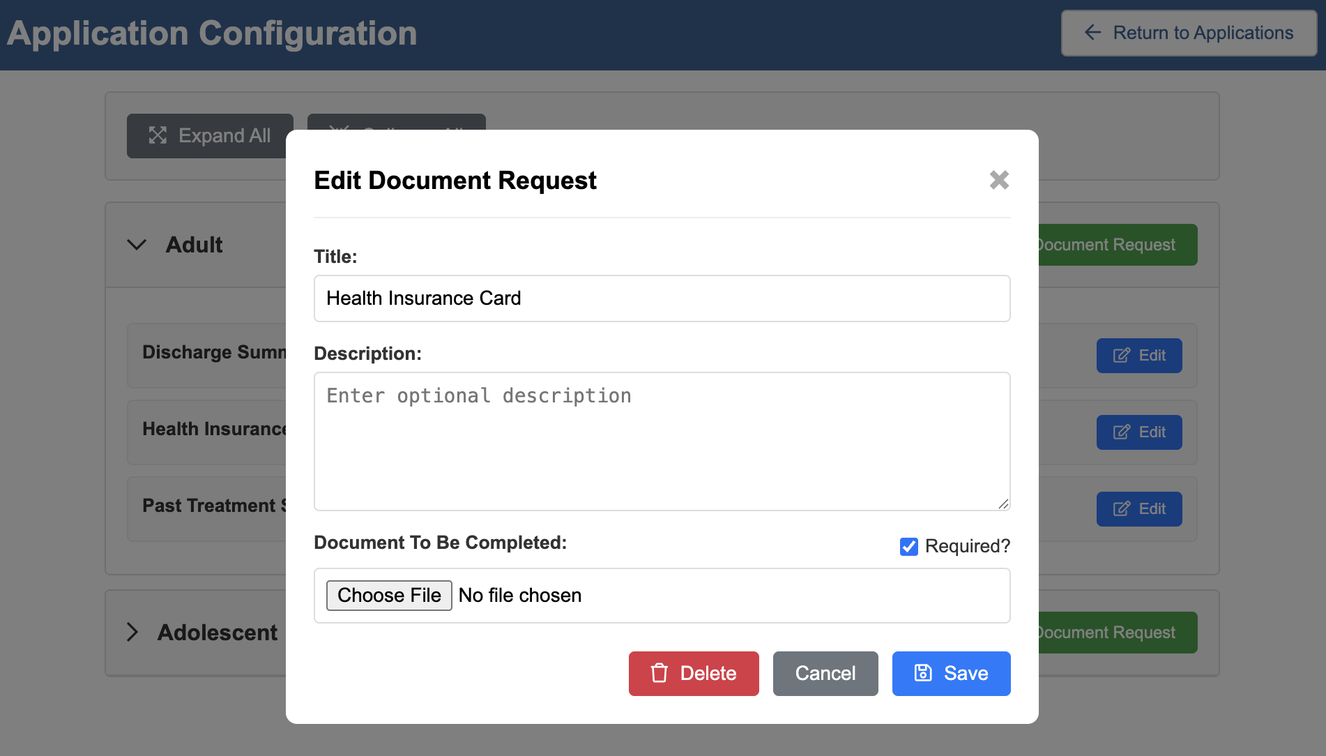 Admissions staff can now customize which documents are needed for different application types (e.g., Adult vs. Adolescent).
