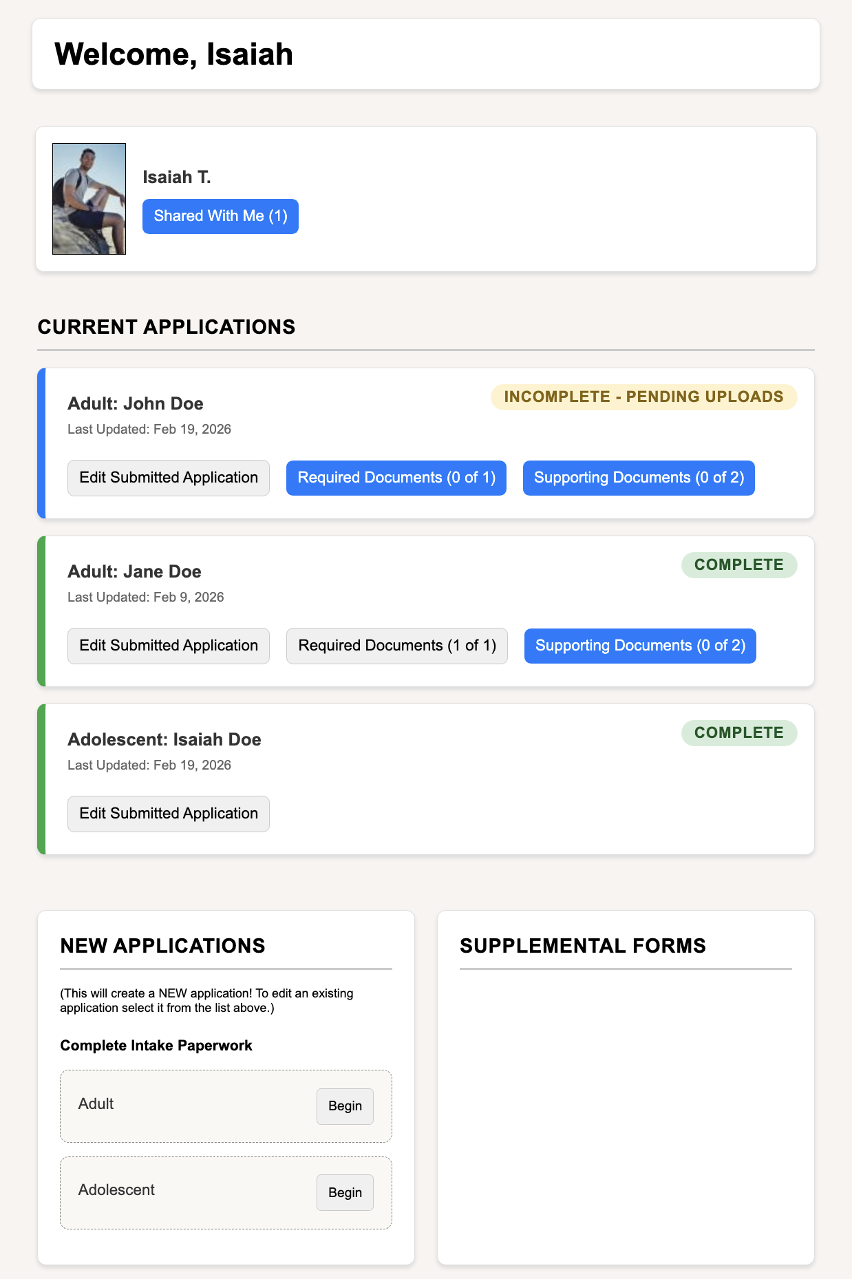 - On the Portal Dashboard, the applicant will see a status of Incomplete - Pending Uploads until all required files are uploaded.