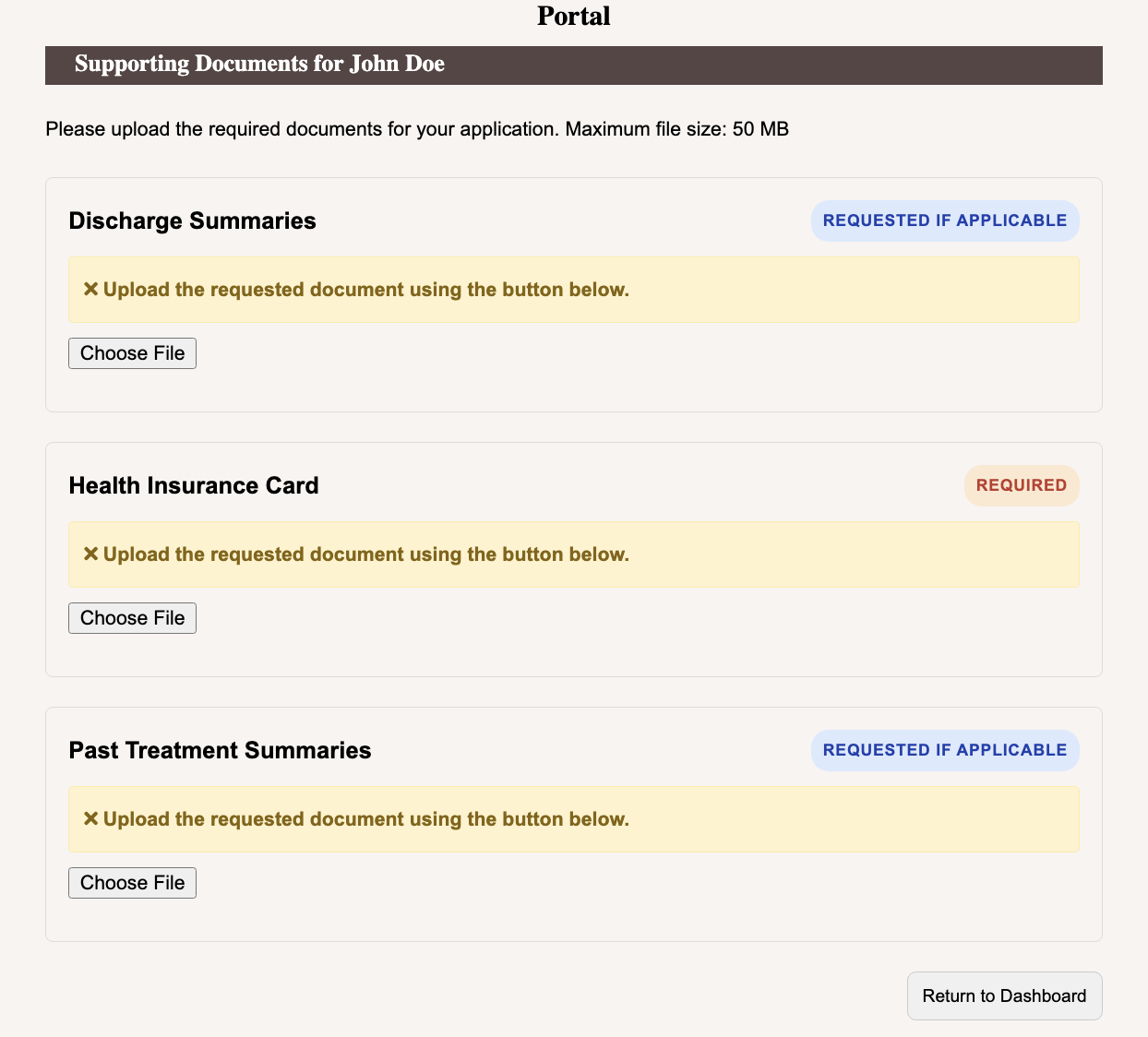 - On the upload page, they can see which files are Required or Requested if applicable.